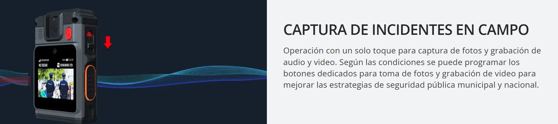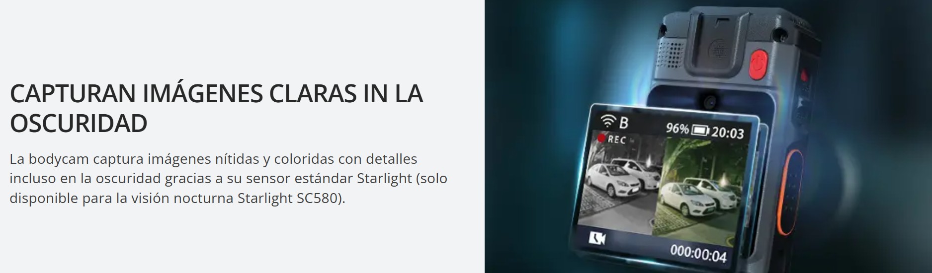 SC-580 es una bodycam inteligente 4G, es capaz de capturar y transmitir videos, audios y fotos desde el campo vía la red celular o WLAN. Con un peso de tan solo 158 gramos, es fácil de operar con una sola mano y la batería permite que trabaje 10 horas seguidas.