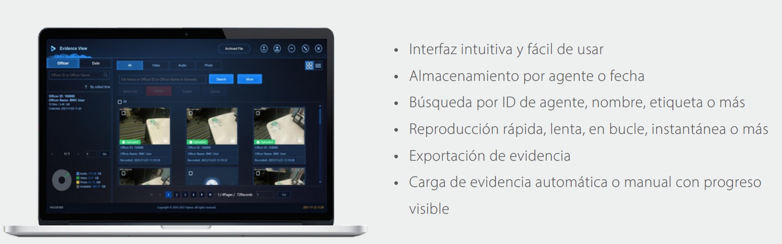 El Software de Recopilación Integrado (IDS) automatiza el proceso de recopilación de vídeos, audios y fotos de las cámaras corporales y los carga en la DEM - Plataforma de Gestión de Evidencia Digital, lo que reduce en gran medida la carga de trabajo manual y ahorra un tiempo valioso a los agentes de las fuerzas de seguridad. Con el Hytera IDS, también puede ver, reproducir y exportar pruebas digitales, así como gestionar y actualizar el firmware de las bodycams a través del cliente web.